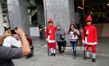 Pengunjung berswafoto dengan Petugas Jogoboro yang menggunakan pakaian prajurit berjaga di jalur pedestrian Malioboro, Yogyakarta, Ahad (6/12). Petugas Jogoboro bertugas menjaga ketertiban dan menjaga kenyamanan pengunjung di Malioboro. Dan pada masa pandemi Covid-19 ikut mengawasi protokol kesehatan pengunjung. Setiap Sabtu dan Ahad sore Jogoboro akan menggunakan pakaian prajurit. (FOTO : Wihdan Hidayat / Republika)