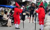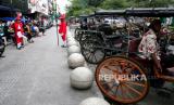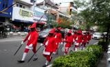 Petugas Jogoboro menggunakan pakaian prajurit menuju pos jaga di jalur pedestrian Malioboro, Yogyakarta, Ahad (6/12). Petugas Jogoboro bertugas menjaga ketertiban dan menjaga kenyamanan pengunjung di Malioboro. Dan pada masa pandemi Covid-19 ikut mengawasi protokol kesehatan pengunjung. Setiap Sabtu dan Ahad sore Jogoboro akan menggunakan pakaian prajurit. (FOTO : Wihdan Hidayat / Republika)