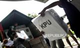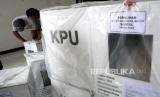 Pekerja membetulkan kotak suara saat pendistribusian logistik Pilkada Kabupaten Bantul di Gudang KPUD Bantul, Yogyakarta, Senin (7/12). Logistik Pilkada yang didistribusikan salah satunya kotak suara, surat suara, bilik pemilihan, alat pencoblosan, dan semua jenis formulir. Proses distribusi untuk 2.085 TPS di 17 Kecamatan dilakukan dua hari Ahad dan Senin. (FOTO : Wihdan Hidayat / Republika)