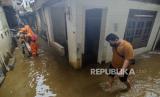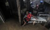 Warga membersihkan rumahnya yang terdampak banjir di kawasan Kebon Pala, Jakarta, Senin (7/12). BPBD DKI Jakarta mencatat sebanyak 34 RT di wilayah Jakarta Timur dan Jakarta Selatan terendam banjir karena tingginya curah hujan sejak Ahad (6/12) malam dan luapan kali Ciliwung dengan ketinggian berkisar 10-80 sentimeter. (FOTO : Republika/Putra M. Akbar)