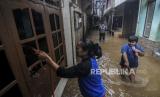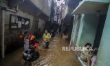 Sejumlah warga beraktivitas saat terjadi banjir di kawasan Kebon Pala, Jakarta, Senin (7/12). BPBD DKI Jakarta mencatat sebanyak 34 RT di wilayah Jakarta Timur dan Jakarta Selatan terendam banjir karena tingginya curah hujan sejak Ahad (6/12) malam dan luapan kali Ciliwung dengan ketinggian berkisar 10-80 sentimeter. (FOTO : Republika/Putra M. Akbar)