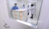 Petugas memindahkan vaksin COVID-19 setibanya di Kantor Pusat Bio Farma, Bandung, Jawa Barat, Senin (7/12/2020). Vaksin COVID-19 produksi perusahaan farmasi Sinovac, China tersebut disimpan dalam ruangan pendingin dengan suhu 2-8 derajat celcius, selanjutnya akan dilakukan pengambilan sampel untuk pengujian mutu oleh tim dari Badan Pengawas Obat dan Makanan (BPOM) dan Bio Farma. (FOTO : MUKHLIS JR/ANTARA )