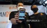 CEO Amalsholeh.com Nur Roni Dinnurohman didampingi musisi Rizal Armada (kiri) menunjukan aplikasi saat peluncuran aplikasi amalsholeh.com, di Kota Bandung, Senin (712). Aplikasi tersebut dalam rangka memberikan kemudahan bagi umat muslim menjalankan ibadah serta berbagi kepada sesama melalui infak, sadekah dan wakaf melalui berbagai program sosial, kemanusiaan dan pemberdayaan. (FOTO : Edi Yusuf/Republika)