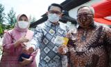 Menteri Riset Teknologi/Kepala Badan Riset Inovasi Nasional (Menristek/BRIN) Bambang Brodjonegoro (kanan) bersama Gubernur Jawa Barat Ridwan Kamil menunjukan alat diteksi covid Covid-19 dari Universitas Padjadjaran (Unpad) pada acara Kunjungan Kerja Menristek/BRIN ke Jawa Barat dalam rangka bakti inovasi untuk penanggulangan Covid-19, di Gedung Sate, Kota Bandung, Senin (8/12). Dalam kesempatan tersebut dihadirkan sejumlah karya inovasi anak bangsa berupa alat penanggulangan Covid-19. (FOTO : Edi Yusuf/Republika)