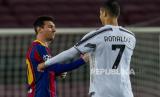 Messi dan Ronaldo berjabat tangan sebelum laga Grup G Liga Champions antara Barcelona vs Juventus di Camp Nou stadium, Barcelona, Spanyol, Rabu (9/12) dini hari. (FOTO : AP Photo/Joan Monfort)