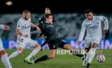 Pemain Moenchengladbach Florian Neuhaus tengah, bertarung memperebutkan bola dengan pemain Real madrid Rodrygo (kanan), dan Karim Benzema pada pertandingan sepak bola grup B Liga Champions antara Real Madrid dan Borussia Monchengladbach di stadion Alfredo Di Stefano di Madrid, Spanyol, Kamis (10/12) dini hari WIB. (FOTO : AP / Bernat Armangue)