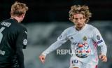 Pemain Real Madrid Luka Modric (kiri), diadang pemain Moenchengladbach Christoph Kramer pada pertandingan sepak bola grup B Liga Champions antara Real Madrid dan Borussia Monchengladbach di stadion Alfredo Di Stefano di Madrid, Spanyol, Kamis (10/12) dini hari WIB. (FOTO : AP / Bernat Armangue)