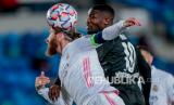Pemain Real Madrid Sergio Ramos (kiri) berebut bola dengan pemain Moenchengladbach Marcus Thuram pada pertandingan sepak bola grup B Liga Champions antara Real Madrid dan Borussia Monchengladbach di stadion Alfredo Di Stefano di Madrid, Spanyol, Kamis (10/12) dini hari WIB. (FOTO : AP / Bernat Armangue)