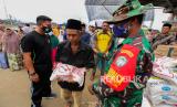 Pengungsi banjir membawa bantuan beras dari posko dapur lapangan TNI di kawasan Landeng, Aceh Utara, Aceh, Rabu (9/12/2020). Data terakhir Badan Penanggulangan Bencana Daerah (BPBD) setempat menyebutkan, jumlah pengungsi banjir Aceh Utara mencapai 19.225 Kepala Keluarga (KK) atau 61.064 jiwa tersebar di 178 lokasi sementara itu lima orang dilaporkan meninggal dunia akibat terseret arus banjir. (FOTO : RAHMAD/ANTARA )