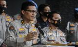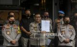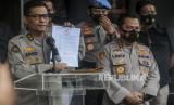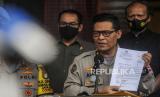 Kadiv Humas Mabes Polri Irjen Pol Argo Yuwono menunjukan surat penetapan tersangka Habib Rizieq Shihab saat konferensi pers di Mapolda Metro Jaya, Jakarta, Kamis (10/12). Berdasarkan hasil gelar perkara pelanggaran protokol kesehatan terkait kerumunan yang terjadi di Petamburan, Kepolisian menetapkan enam tersangka yang salah satunya Imam Besar FPI Habib Rizieq Shihab dan melakukan pencekalan untuk tidak berpergian ke luar Indonesia. (FOTO : Republika/Putra M. Akbar)