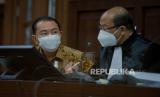 Terpidana kasus cessie Bank Bali Djoko Tjandra (kiri) mendengarkan kesaksian mantan Kakorwas PPNS Bareskrim Polri Brigjen Pol Prasetijo Utomo, di Pengadilan Tipikor, Jakarta, Kamis (10/12). Dalam sidang tersebut Jaksa Penuntut Umum menghadirkan dua orang saksi yaitu mantan Kepala Divisi Hubungan Internasional Polri Irjen Pol Napoleon Bonaparte dan mantan Kakorwas PPNS Bareskrim Polri Brigjen Pol Prasetijo Utomo dalam perkara dugaan suap kepada jaksa dan perwira tinggi Polri terkait penghapusan status red notice terhadap terdakwa Djoko Tjandra. Republika/Thoudy Badai (FOTO : Republika/Thoudy Badai)