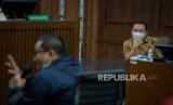 Terpidana kasus cessie Bank Bali Djoko Tjandra (kanan) mendengarkan kesaksian mantan Kakorwas PPNS Bareskrim Polri Brigjen Pol Prasetijo Utomo, di Pengadilan Tipikor, Jakarta, Kamis (10/12). Dalam sidang tersebut Jaksa Penuntut Umum menghadirkan dua orang saksi yaitu mantan Kepala Divisi Hubungan Internasional Polri Irjen Pol Napoleon Bonaparte dan mantan Kakorwas PPNS Bareskrim Polri Brigjen Pol Prasetijo Utomo dalam perkara dugaan suap kepada jaksa dan perwira tinggi Polri terkait penghapusan status red notice terhadap terdakwa Djoko Tjandra. Republika/Thoudy Badai (FOTO : Republika/Thoudy Badai)