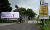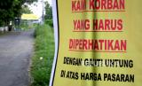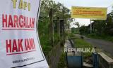Spanduk penolakan ganti rugi lahan di pasang di sudut Dusun Temanggal 1, Kalasan, Sleman, Yogyakarta, Jumat (11/12). Warga menolak rendahnya ganti rugi lahan warga yang terdampak proyek Jalan Tol Jogja-Solo. Di Dusun Temanggal 1 ada sekitar 150 warga yang terdampak proyek tol ini. (FOTO : Wihdan Hidayat / Republika)
