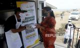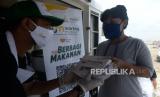 Petugas Warteg Mobile Laznas BSM Umat membagikan makanan siap saji untuk masyarakat di kawasan pemukiman Nelayan, Cilincing, Jakarta, Jumat (11/12). Mandiri Syariah bersinergi dengan Laznas BSM Umat, Relawan Nusantara Rumah Zakat (RZ), Dompet Dhuafa, ACT dan Dongeng Ceria Indonesia membantu meringankan beban masyarakat kurang mampu di masa pandemi melalui penyebaran 7 unit Warteg Mobile yang beroperasi di Jabodetabek dan Bandung. (FOTO : Prayogi/Republika)