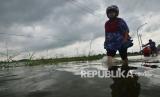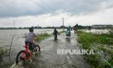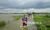 REPUBLIKA.CO.ID, KUDUS -- Warga melintasi jalan yang tergenang banjir di Karangturi, Setrokalangan, Kudus, Jawa Tengah, Sabtu (12/12/). Intensitas hujan yang tinggi serta meluapnya sungai Wulan menyebabkan jalan utama di desa itu terendam banjir dengan ketinggian hingga 40 centimeter sejak dua hari terakhir, sehingga ativitas warga terganggu.