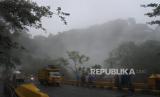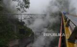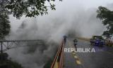 Banjir lahar dingin Gunung Semeru yang melintasi di Jembatan Piket Nol, Candipuro, Lumajang, Jawa Timur, membawa abu yang masih panas panas, mengeluarkan asap dan berbau belerang.