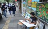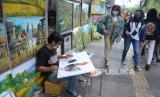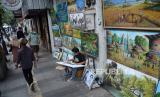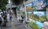 Seorang pelukis sekaligus penjual lukisan, Dede Amyang menungu pembeli sambil melukis di Jalan Braga, Kota Bandung, Ahad (13/12). Saat pandemi penjualan lukisan mengalami penurunan, hal tersebut dipengaruhi oleh turunnya pengunjung dari luar kota khususnya Jakarta. (FOTO : Edi Yusuf/Republika)