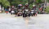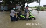 REPUBLIKA.CO.ID, GRESIK -- Warga mengendarai motor melintasi banjir di Jalan Benjeng, Kabupaten Gresik, Jawa Timur, Senin (14/12/2020).