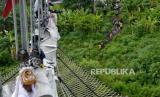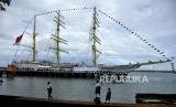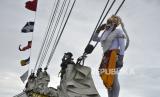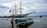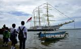 Warga menyaksikan Taruna-Taruni AAL tingkat III angkatan ke-67 melaksanakan peran parade roll di atas KRI Bima Suci-945 saat tiba di Dermaga Pangkalan AL Tual, Ambon, Maluku, Senin (14/12/2020). KRI Bima Suci bersandar sementara di Tual sebelum melanjutkan pelayaran etape kesepuluh menuju Kupang untuk melaksanakan Satgas operasi Bima Suci 2020 dalam mendukung latihan praktek Kartika Jala Krida (KJK) 2020. (FOTO : ANTARA/Abriawan Abhe)