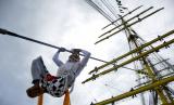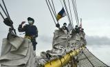 Taruna-Taruni AAL tingkat III angkatan ke-67 melaksanakan peran parade roll di atas KRI Bima Suci-945 saat tiba di Dermaga Pangkalan AL Tual, Ambon, Maluku, Senin (14/12/2020). KRI Bima Suci bersandar sementara di Tual sebelum melanjutkan pelayaran etape kesepuluh menuju Kupang untuk melaksanakan Satgas operasi Bima Suci 2020 dalam mendukung latihan praktek Kartika Jala Krida (KJK) 2020. (FOTO : ANTARA/Abriawan Abhe)