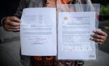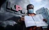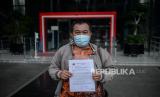 Koordinator Masyarakat Anti Korupsi Indonesia (MAKI) Boyamin Saiman menunjukkan surat laporan dugaan korupsi penyaluran bantuan sosial Covid-19 Kementerian Sosial di Gedung Komisi Pemberantasan Korupsi (KPK), Jakarta, Rabu (16/12). Berdasarkan penelusuran MAKI, paket Bansos COVID-19 yang disalurkan kepada masyarakat oleh Kementerian Sosial berupa 10 kilogram beras, dua liter minyak goreng, dua kaleng sarden 188 gram, satu kaleng roti biskuit kelapa 600 gram, satu susu bubuk kemasan 400 gram dan satu tas kain tersebut hanya seharga Rp188 ribu dari nominal yang seharusnya bernilai Rp300 ribu. Republika/Thoudy Badai (FOTO : Republika/Thoudy Badai)