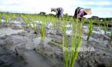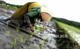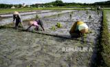 Petani menanam padi jenis c64 di persawahan Bangunjiwo, Bantul, Yogyakarta, Rabu (16/12). Petani memasuki musim tanam ke-3 di persawahan Bangunjiwo yang mendapat pengairan irigasi. Produksi gabah lebih baik, karena tetap bisa bertanam pada musim kemarau. (FOTO : Wihdan Hidayat / Republika)