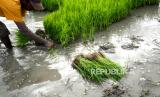 Petani menngambil bibit padi jenis c64 di persawahan Bangunjiwo, Bantul, Yogyakarta, Rabu (16/12). Petani memasuki musim tanam ke-3 di persawahan Bangunjiwo yang mendapat pengairan irigasi. Produksi gabah lebih baik, karena tetap bisa bertanam pada musim kemarau. (FOTO : Wihdan Hidayat / Republika)