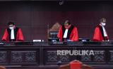 Ketua Mahkamah Konstitusi (MK) Arief Hidayat (tengah) bersama Hakim Konstitusi Manahan MP Sitompul (kiri) dan Saldi Isra (kanan) bersiap memimpin sidang Pengujian Materiil Undang-Undang Nomor 11 Tahun 2020 tentang Cipta Kerja terhadap UUD 1945 di ruang sidang pleno Gedung MK, Jakarta, Rabu (16/12/2020). Sidang tersebut beragendakan perbaikan permohonan yang diajukan pemohon yaitu Konfederasi Serikat Pekerja Indonesia (KSPI) yang diwakili oleh Presiden Dewan Eksekutif Nasional KSPI Said Iqbal dan Sekjen Ramidi. (FOTO : Antara/Muhammad Adimaja)