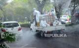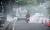 Penyemprotan desinfektan di ruas jalan kota kembali rutin dilakukan petugas menyusul status zona merah penyebaran Covid-19 kembali disandang Kota Bandung.