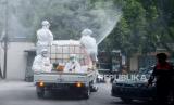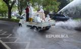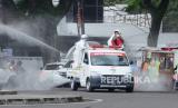 REPUBLIKA.CO.ID, BANDUNG -- Petugas PMI Kota Bandung, menyemprotkan cairan disinfektan di Jalan Citarum, Jumat (18/12).