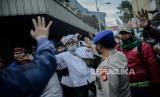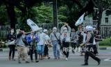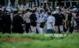Aparat kepolisian mengamankan sejumlah massa aksi unjuk rasa 1812 Front Pembela Islam (FPI) yang hendak menggelar aksi di sekitar Patung Kuda Arjuna Wiwaha, Jakarta Pusat, Jumat (18/12). Polisi memukul mundur massa yang menolak dibubarkan guna menghindari kerumunan. Sebanyak 5.000 personel gabungan dari unsur TNI-Polri dan Pemprov DKI Jakarta disiapkan untuk mengawal dan mengamankan unjuk rasa 1812 di kawasan Istana Negara. (FOTO : Republika/Thoudy Badai)