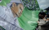 Aparat kepolisian mengamankan banner HRS saat unjuk rasa 1812 Front Pembela Islam (FPI) di sekitar Patung Kuda Arjuna Wiwaha, Jakarta Pusat, Jumat (18/12). Polisi memukul mundur massa yang menolak dibubarkan guna menghindari kerumunan. Sebanyak 5.000 personel gabungan dari unsur TNI-Polri dan Pemprov DKI Jakarta disiapkan untuk mengawal dan mengamankan unjuk rasa 1812 di kawasan Istana Negara. (FOTO : Republika/Thoudy Badai)