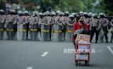 Pedagang berjalan saat pengamanan aksi unjuk rasa 1812 Front Pembela Islam (FPI) di kawasan Kebon Jahe, Jakarta Pusat, Jumat (18/12). Polisi memukul mundur massa yang menolak dibubarkan guna menghindari kerumunan. Sebanyak 5.000 personel gabungan dari unsur TNI-Polri dan Pemprov DKI Jakarta disiapkan untuk mengawal dan mengamankan unjuk rasa 1812 di kawasan Istana Negara. (FOTO : Republika/Thoudy Badai)