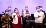 Rektor Amikom, Suyanto (kedua kanan), Presiden Silicon Valley Innovation Center, Andrey Kunov (kanan) bersama staff Amikom berfoto bersama usai penandatanganan kerjasama di Graha Amikom, Yogyakarta, Senin (21/12). Pada acara dilakukan penandatangan kerjasama akademik dan bisnis antara Amikom dan Silicon Valley. Selain itu juga ada kuliah umum oleh Andrey Kunov untuk undangan terbatas dan secara daring untuk umum. (FOTO : Wihdan Hidayat / Republika)