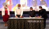 Rektor Amikom, Suyanto (kedua kanan) bersama Presiden Silicon Valley Innovation Center, Andrey Kunov (kedua kiri) menandatangani draft kerjasama di Graha Amikom, Yogyakarta, Senin (21/12). Pada acara dilakukan penandatangan kerjasama akademik dan bisnis antara Amikom dan Silicon Valley. Selain itu juga ada kuliah umum oleh Andrey Kunov untuk undangan terbatas dan secara daring untuk umum. (FOTO : Wihdan Hidayat / Republika)