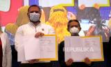 Rektor Amikom, Suyanto (kanan) menunjukan draft kerja sama dengan Presiden Silicon Valley Innovation Center, Andrey Kunov di Graha Amikom, Yogyakarta, Senin (21/12). Pada acara dilakukan penandatangan kerjasama akademik dan bisnis antara Amikom dan Silicon Valley. Selain itu juga ada kuliah umum oleh Andrey Kunov untuk undangan terbatas dan secara daring untuk umum. (FOTO : Wihdan Hidayat / Republika)