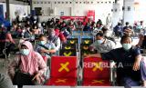 Calon penumpang kereta api jarak jauh antre menunggu giliran tes cepat antigen di Stasiun Yogyakarta, Selasa (22/12). Mulai Selasa (22/12) KAI mewajibkan calon penumpang kereta api jarak jauh memiliki bukti tes cepat antigen dengan hasil nonreaktif. Di Stasiun Yogyakarta disediakan kuota tes cepat antigen sebanyak 300 orang pada hari pertama. Dan untuk tes cepat dipungut biaya Rp 105 ribu dengan menunjukkan tiket atau kode booking kereta api. (FOTO : Wihdan Hidayat / Republika)