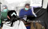 Petugas medis melakukan pengambilan sampel tes cepat antigen penumpang kereta api jarak jauh di Stasiun Yogyakarta, Selasa (22/12). Mulai Selasa (22/12) KAI mewajibkan calon penumpang kereta api jarak jauh memiliki bukti tes cepat antigen dengan hasil nonreaktif. Di Stasiun Yogyakarta disediakan kuota tes cepat antigen sebanyak 300 orang pada hari pertama. Dan untuk tes cepat dipungut biaya Rp 105 ribu dengan menunjukkan tiket atau kode booking kereta api. (FOTO : Wihdan Hidayat / Republika)