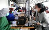 Calon penumpang kereta api jarak jauh membayar biaya tes cepat antigen di Stasiun Yogyakarta, Selasa (22/12). Mulai Selasa (22/12) KAI mewajibkan calon penumpang kereta api jarak jauh memiliki bukti tes cepat antigen dengan hasil nonreaktif. Di Stasiun Yogyakarta disediakan kuota tes cepat antigen sebanyak 300 orang pada hari pertama. Dan untuk tes cepat dipungut biaya Rp 105 ribu dengan menunjukkan tiket atau kode booking kereta api. (FOTO : Wihdan Hidayat / Republika)