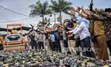 Sejumlah perwakilan instansi terkait memusnahkan barang bukti minuman keras saat acara pemusnahan barang bukti hasil tindak pidana narkoba di Polda Jawa Barat, Jalan Soekarno Hatta, Kota Bandung, Selasa (22/12). Kepolisian Daerah (Polda) Jawa Barat memusnahkan barang bukti tindak pidana narkoba hasil pengungkapan periode Juli hingga Desember 2020 berupa 14.487,16 gram sabu, 1.500,64 gram ganja, 161.518 butir obat-obatan terlarang, 120.641,74 gram tembakau sintetis, 64 jeriken tuak dan 20.057 botol minuman keras. (FOTO : ABDAN SYAKURA/REPUBLIKA)