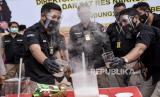 Personil Ditresnarkoba Polda Jabar menunjukkan barang bukti tembakau sintetis saat acara pemusnahan barang bukti hasil tindak pidana narkoba di Polda Jawa Barat, Jalan Soekarno Hatta, Kota Bandung, Selasa (22/12). Kepolisian Daerah (Polda) Jawa Barat memusnahkan barang bukti tindak pidana narkoba hasil pengungkapan periode Juli hingga Desember 2020 berupa 14.487,16 gram sabu, 1.500,64 gram ganja, 161.518 butir obat-obatan terlarang, 120.641,74 gram tembakau sintetis, 64 jeriken tuak dan 20.057 botol minuman keras. (FOTO : ABDAN SYAKURA/REPUBLIKA)