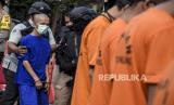 Sejumlah tersangka dihadirkan saat acara pemusnahan barang bukti hasil tindak pidana narkoba di Polda Jawa Barat, Jalan Soekarno Hatta, Kota Bandung, Selasa (22/12). Kepolisian Daerah (Polda) Jawa Barat memusnahkan barang bukti tindak pidana narkoba hasil pengungkapan periode Juli hingga Desember 2020 berupa 14.487,16 gram sabu, 1.500,64 gram ganja, 161.518 butir obat-obatan terlarang, 120.641,74 gram tembakau sintetis, 64 jeriken tuak dan 20.057 botol minuman keras. (FOTO : ABDAN SYAKURA/REPUBLIKA)