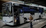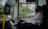 Pengemudi mengoperasikan Kendaraan bus listrik skywell saat pra uji coba di kawasan SCBD, Jakarta, Selasa (22/12). PT Kendraan Listrik Indonesia melakukan pra uji coba kendaraan listrik merek skywell tipe NJL6126BEV yang dicanangkan akan menjadi bagian dari sarana transportasi di Ibu Kota melalui kerjasama dengan Transjakarta setelah melakukan tahap pra uji coba dan uji coba. (FOTO : Republika/Thoudy Badai)