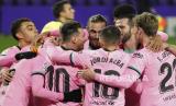 Barcelona Lionel Messi dan tim Barcelona merayakan golnya pada laga La Liga antara Valladolid dan Barcelona di Jose Zorrilla stadium, Valladolid, Spanyol, Rabu (23/12) dini hari WIB. (FOTO : POOL AFP/Cesar Manso/Pool via AP)