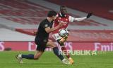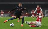 Nicolas Pepe (kanan) melepas tendangan pada laga babak perempat final Piala Liga Inggris (Carabao Cup) antara Arsenal FC melawan Manchester City di London, Rabu (23/12) dini hari WIB. (FOTO : EPA-EFE/NEIL HALL )