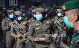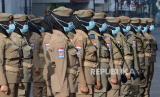 Barisan Duta Perubahan Perilaku dari Satpol PP Kota Bandung saat Apel Gelar Pasukan Pengamanan Malam Natal dan Tahun Baru 2021, di Jalan Dalem Kaum, Kota Bandung, Rabu (23/12). Pemkot Bandung resmi melarang adanya perayaan atau pesta pergantian Tahun Baru 2021. Para petugas di antaranya akan mengawasi tempat-tempat yang disinyalir menjadi titik kerumunan di Kota Bandung, bagi pelanggar akan dikenakan sanksi sesuai aturan yang berlaku. (FOTO : Edi Yusuf/Republika)