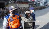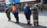 Petugas gabungan mengikuti Apel Gelar Pasukan Pengamanan Malam Natal dan Tahun Baru 2021, di Jalan Dalem Kaum, Kota Bandung, Rabu (23/12). Pemkot Bandung resmi melarang adanya perayaan atau pesta pergantian Tahun Baru 2021. Para petugas di antaranya akan mengawasi tempat-tempat yang disinyalir menjadi titik kerumunan di Kota Bandung, bagi pelanggar akan dikenakan sanksi sesuai aturan yang berlaku. (FOTO : Edi Yusuf/Republika)