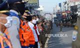 Wakil wali Kota Bandung Yana Mulyana memasangkan pita kepada petugas saat Apel Gelar Pasukan Pengamanan Malam Natal dan Tahun Baru 2021, di Jalan Dalem Kaum, Kota Bandung, Rabu (23/12). Pemkot Bandung resmi melarang adanya perayaan atau pesta pergantian Tahun Baru 2021. Para petugas di antaranya akan mengawasi tempat-tempat yang disinyalir menjadi titik kerumunan di Kota Bandung, bagi pelanggar akan dikenakan sanksi sesuai aturan yang berlaku. (FOTO : Edi Yusuf/Republika)