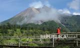 Pengunjung menikmati suasana pemandangan Gunung Merapi di Kalitalang, Balerante, Kemalang, Klaten, Jawa Tengah, Kamis (24/12/2020). Berdasarkan data pengamatan Balai Penyelidikan dan Pengembangan Teknologi Kebencanaan Geologi (BPPTKG) periode (23/12/2020) untuk laju deformasi Gunung Merapi dari EDM Babadan sebesar 10 centimeter per hari dalam tiga hari dengan kegempaan guguran sebanyak 44, fase banyak 265, vulkanik dangkal 56, tetonik satu dan hembusan 65. (FOTO : Antara/Aloysius Jarot Nugroho)