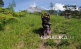 Seorang warga mengangkut kayu di kaki Gunung Merapi, Kalitalang, Balerante, Kemalang, Klaten, Jawa Tengah, Kamis (24/12/2020). Berdasarkan data pengamatan Balai Penyelidikan dan Pengembangan Teknologi Kebencanaan Geologi (BPPTKG) periode (23/12/2020) untuk laju deformasi Gunung Merapi dari EDM Babadan sebesar 10 centimeter per hari dalam tiga hari dengan kegempaan guguran sebanyak 44, fase banyak 265, vulkanik dangkal 56, tetonik satu dan hembusan 65. (FOTO : Antara/Aloysius Jarot Nugroho)